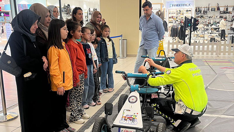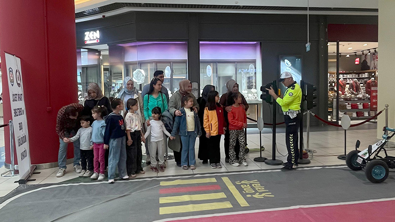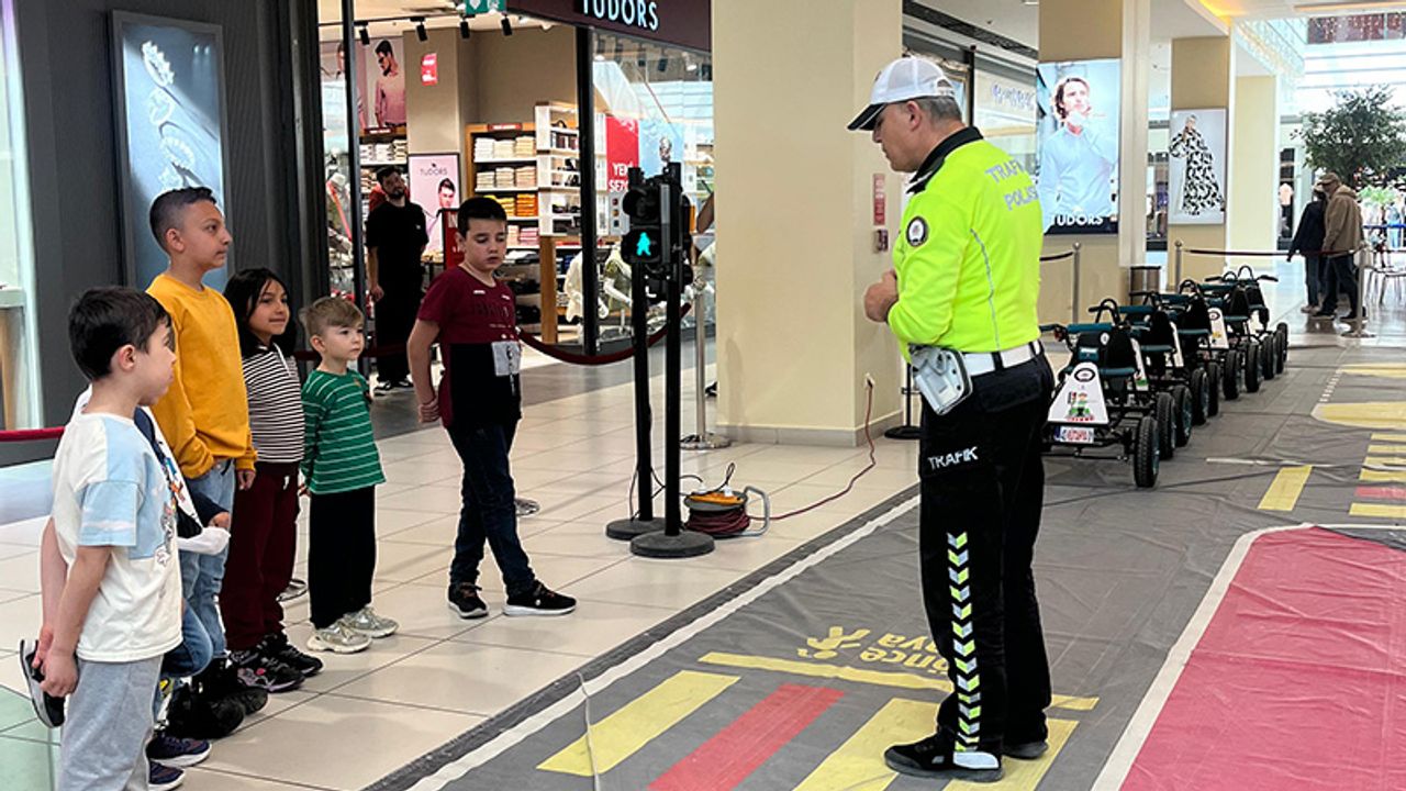 Kentteki bir alışveriş merkezindeki eğitimlerde Kıdemli Başpolis Ahmet Kahraman, çocuklara hem teorik hem de pratik eğitim verdi.