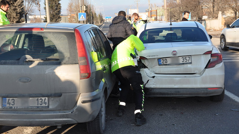 İki otomobilin çarpıştığı kazada yine aynı yönde seyreden 43 … 134 plakalı otomobil de önündeki otomobillere çarptı.