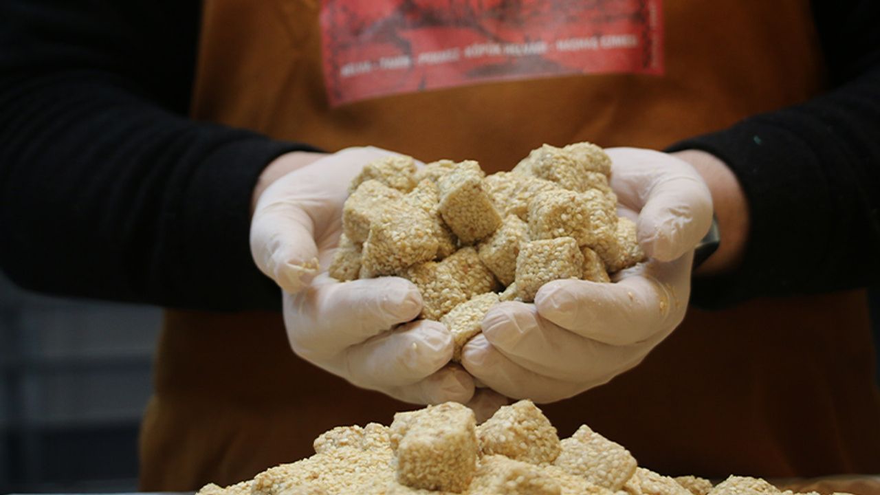 “İçinde kesinlikle nişasta ya da herhangi bir katkı maddesi bulunmamaktadır. Sadece şerbet ve susam var. İlk önce özel bir şerbetimizi bakır kazanlarda kaynatıyoruz. Sonra soğumaya bırakıyoruz. Bu işlemden sonra susamımızı, şerbetimizle birlikte karıştırıyoruz.”