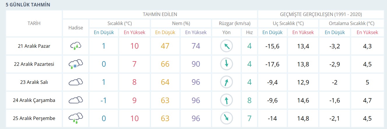 Tahminlere göre pazartesi günü Kütahya'da karla karışık yağmur bekleniyor. 22 Aralık Pazartesi günü hava sıcaklığı en düşük 0, en yüksek ise 8 derece olarak ölçülecek. Salı günü yağış yerini çok bulutlu bir havaya bırakırken, çarşamba günü ise gök gürültülü sağanak yağış etkili olacak. Zemheri soğuklarının yaklaştığı bu günlerde, gece sıcaklıklarının eksi değerlerde seyretmesi buzlanma riskini de beraberinde getiriyor.