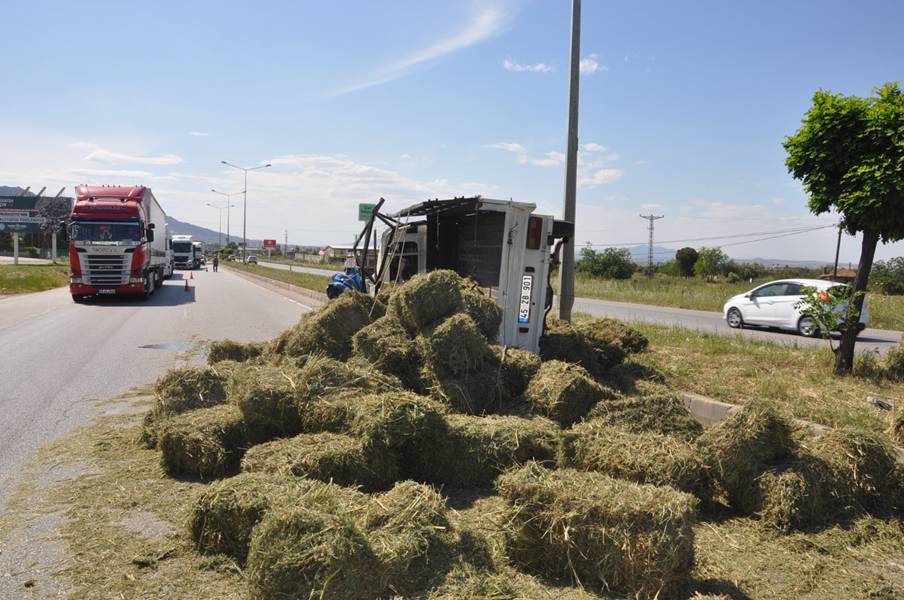 Kaza nedeniyle bir süre tek şeritten sağlanan trafik, aracın ve yola dağılan saman balyalarının kaldırılmasının ardından normale döndü.