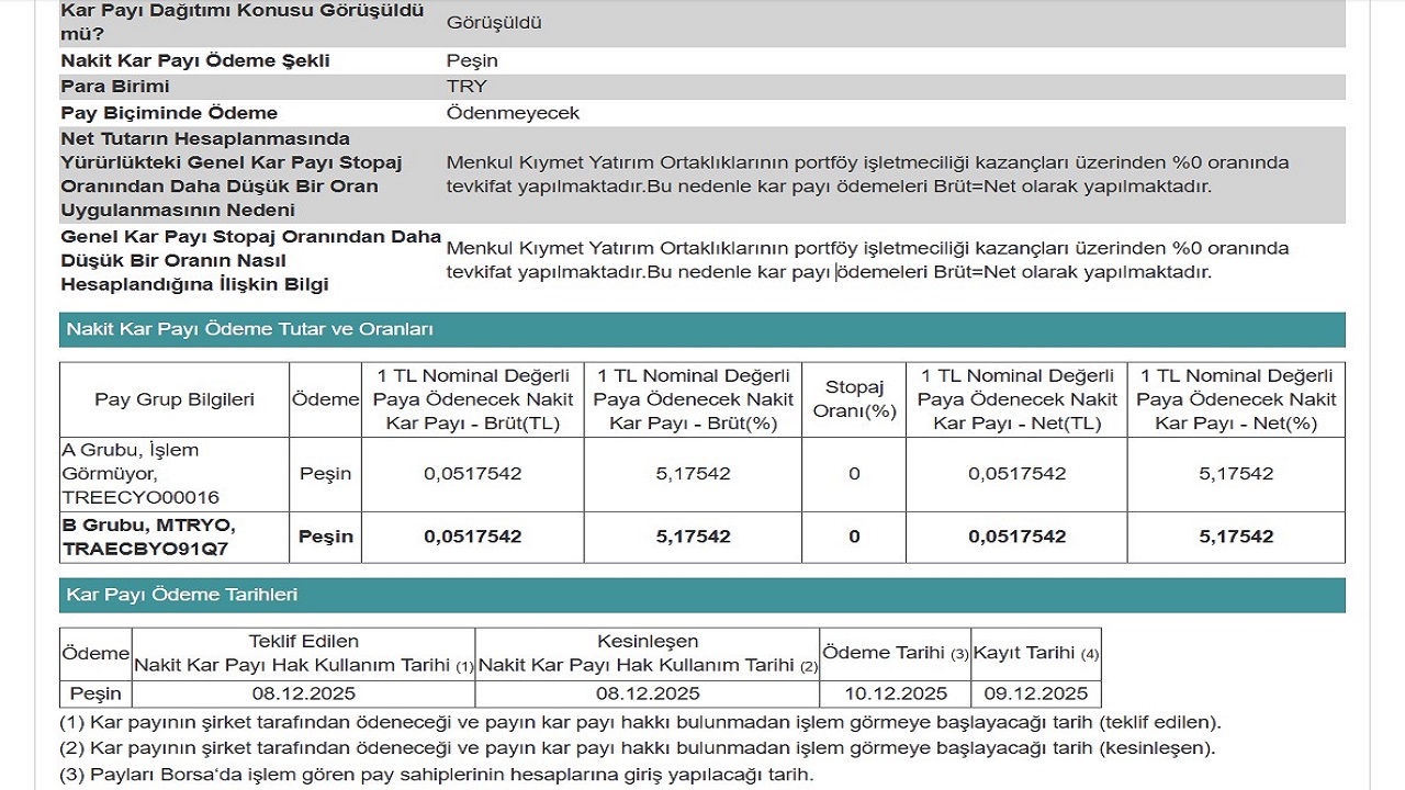 Portföyünde 1000 lot MTRYO hisse bulunan yatırımcının hesabına 51,75 TL kar payı ödemesi geçecek.