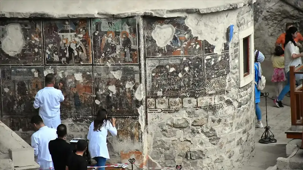 Trabzon'un Maçka ilçesi Altındere Vadisi'ndeki dünyaca ünlü Sümela Manastırı'nda yer alan Ana Kaya Kilisesi'nin duvarlarında bulunan freskler aslına uygun restore ediliyor.