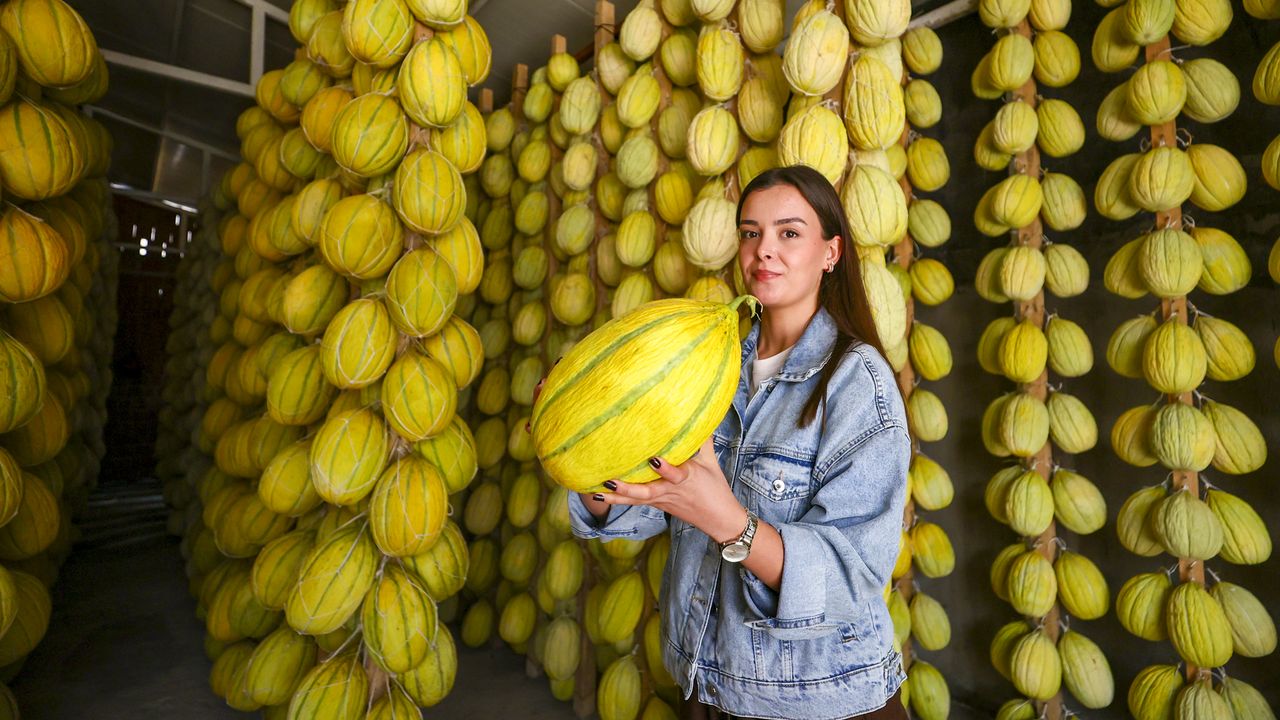 Depolarda asılı halde bekleyen kavunlar, kasım ayından itibaren yavaş yavaş pazarlara inmeye başlıyor.