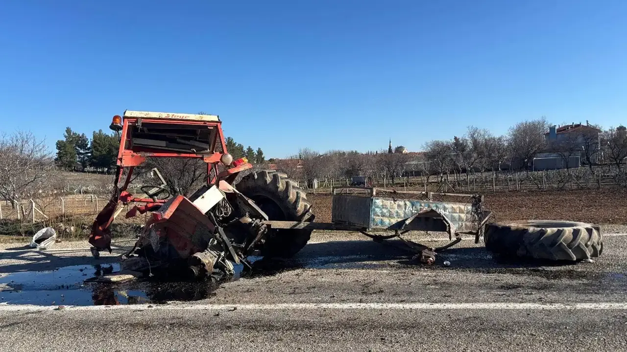 Uşak’ın Ulubey ilçesi Hasköy köyü yakınlarında M.Ö. (35) yönetimindeki 64 EG 436 plakalı kamyon, tali yoldan çıkan A.B. (73) idaresindeki 64 AS 524 plakalı traktörle çarpıştı. Çarpışmanın şiddetiyle traktör ikiye bölündü ve ağır hasar aldı.