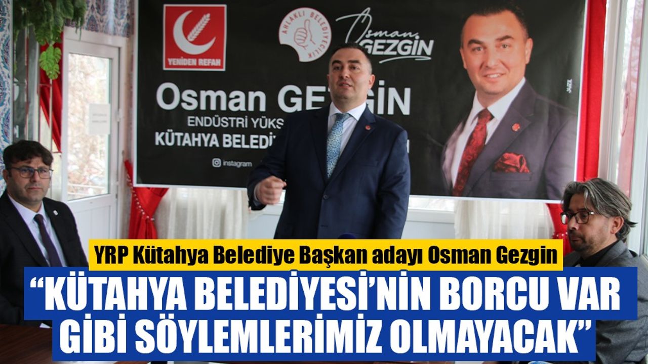 YRP Kütahya Belediye Başkanı adayı Osman Gezgin, seçilmeleri halinde hiçbir bahane üretmeyeceklerini söyledi. Gezgin, “2019 yılının ilk günlerinde yaşandığı gibi, belediyenin şu kadar borcu varmış, dolayısıyla altı ay vakit istiyoruz gibi söylemlerle karşılaşmazsınız.” dedi.  Yeniden Refah Partisi (YRP) Kütahya Belediye Başkanı adayı Osman Gezgin, projelerini açıkladı.  31 Mart yerel seçimlerinde partisinin belediye başkanı adayı olarak tanıtılan Gezgin, Kütahya basın mensuplarıyla buluştu.  Parti olarak adayları en son açıklamalarının nedenini açıklayan Gezgin, seçilmeleri halinde Kütahya’da anılacak projelere imza atacaklarını söyledi.  Belediye yönetiminde tecrübeli olduğunu vurgulayan Gezgin, hazırladıkları projeleri sosyal medya aracılığı ile tanıtmaya başlayacaklarını dile getirdi.