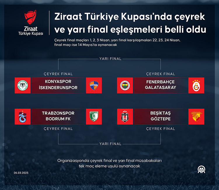 Ziraat Türkiye Kupası'nda yarı final karşılaşmaları 22, 23 ve 24 Nisan tarihlerinde oynanacak. Kupada şampiyonu belirleyecek büyük final ise 14 Mayıs'ta gerçekleştirilecek.